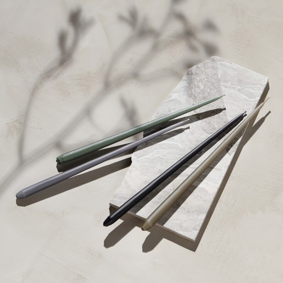 The exclusive, hand-colored STOFF taper candles by Danish Ester & Erik have a long and tapered shape with a cone-shaped bottom to make them fit perfectly in the STOFF Nagel candle holders. The candles do not drip, are self-extinguishing, and burn out slowly and elegantly so that no residues are left in your candle holders.